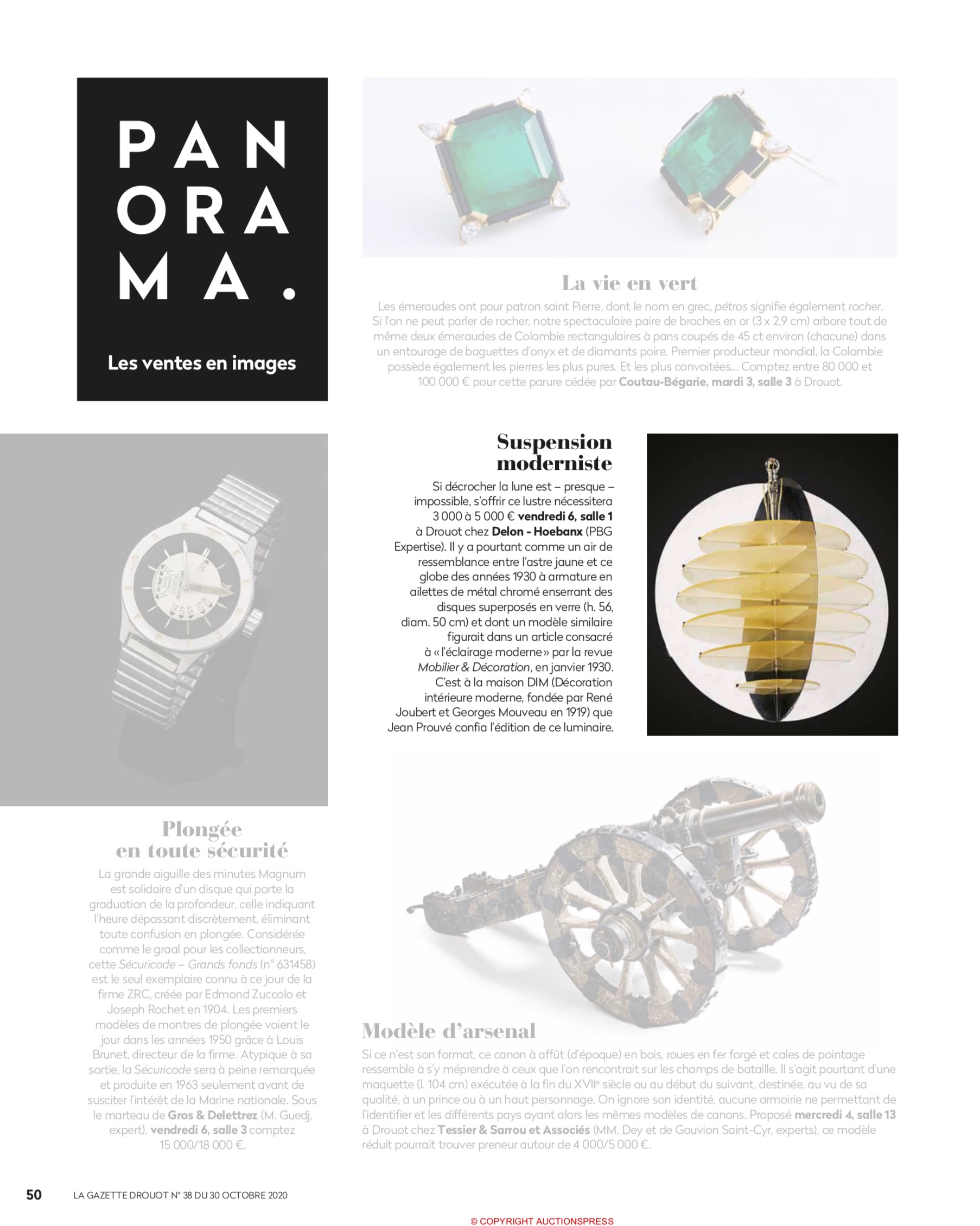 D’Émile Gallé, un vase bilobé à décor d’hellébores (ou roses de Noël) en verre teinté vert d’eau dégagé à l’acide (vers 1890-1900) requerra 3 000/4 000 €, tandis qu’un résultat entre 3 000 et 5 000 € pourrait accueillir une armoire en fer forgé martelé à deux portes de panneaux de bois des années 1920, attribuée aux établissements Muller puis une suspension moderniste en verre et métal chromé de Jean Prouvé, éditée par DIM. Ou même encore un lampadaire dit Simple de Serge Mouille (modèle créé en 1953) en fil d’acier et tôle d’aluminium repoussé laqué noir. Plusieurs meubles de René Gabriel sont présentés dont une paire de fauteuils en chêne à dossier et assise de Skaï rouge (3 000/4 000 €). Un fauteuil de Gianni Moscatelli (édition Formanova) des années 1970, en lames plates de métal enserrant une assise et un dossier en Skaï vert et blanc cassé, avance une estimation de 2 500/3 000 €, une table en laiton doré soudé à épais plateau de marbre rouge sur un piétement végétal de Jacques Duval-Brasseur (pièce unique vers 1970-1975), celle de 5 500/6 500 €. Une paren- thèse sous le numéro 114, constitué d’un lot de 19 photo- graphies des années 1920-1930 représentant des avions (principalement des Nieuport), certains accompagnés de leurs pilotes (Nungesser, Malard, Pagoud), et pour lequel 3 500/4 500 € sont prévus.