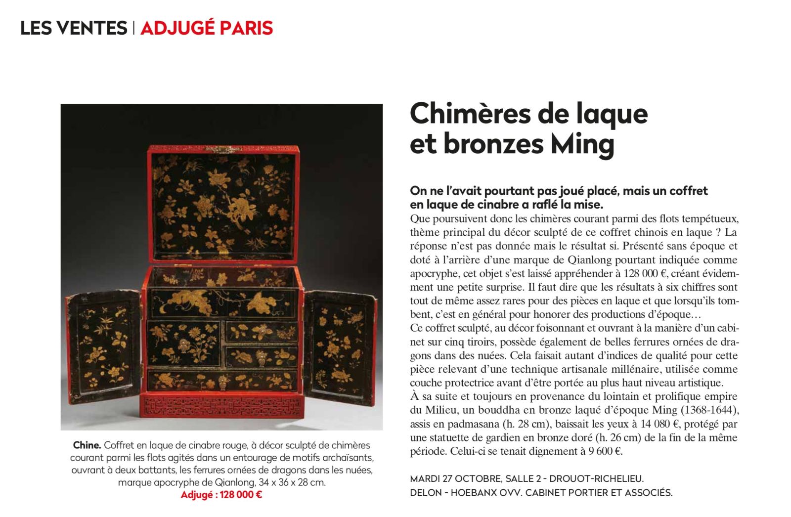 ... dans une salle voisine et chez Delon - Hoebanx, un coffret en laque de cinabre portant une marque apocryphe de Qianlong s’ouvrait pour retenir une enchère de 128 000 €.